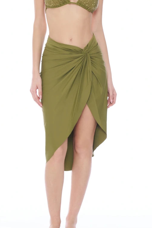 Falda pareo largo confeccionada en tela fluida y elegante, disponible en un sofisticado verde foresta....