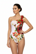 Bañador asimétrico de Raffaela D'Angelo que combina elegancia y originalidad. Diseño exclusivo con fondo blanco inmaculado y detalle de macramé artesanal con flores rojas que aporta textura y movimiento. El corte asimétrico favorece la silueta y proporciona un toque sofisticado y contemporáneo. Prenda versátil que destaca por su confección cuidada y su capacidad para transformar cualquier momento en la playa o piscina en una declaración de estilo personal.