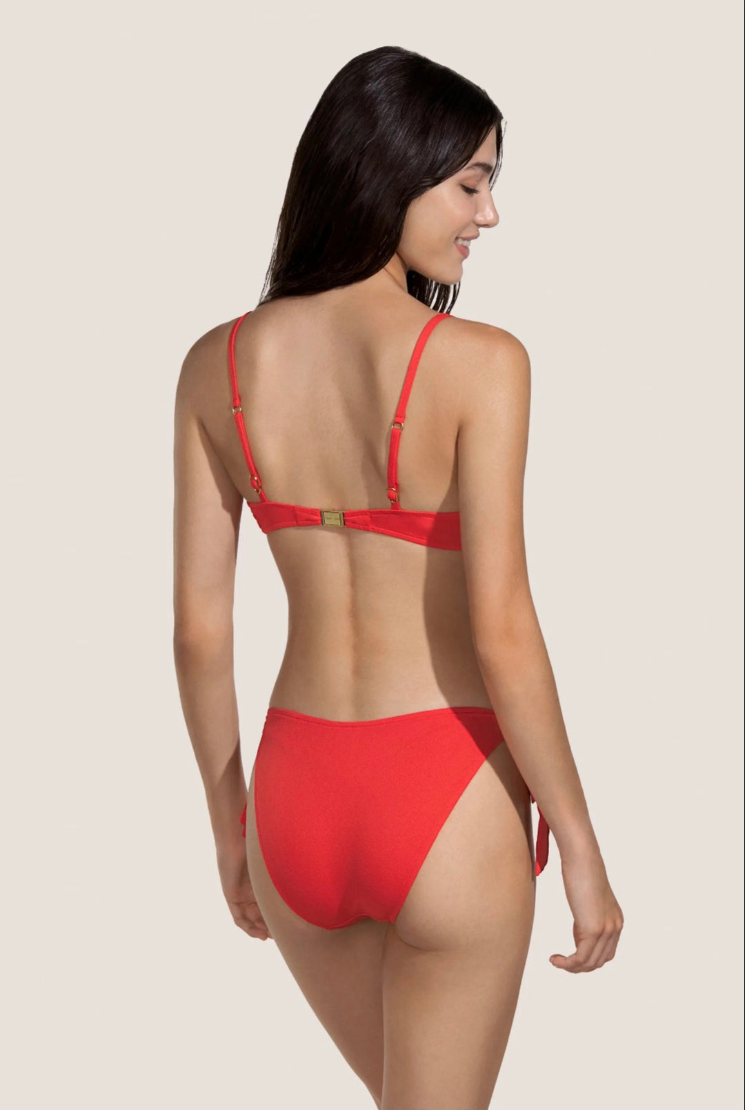 This Andres Sarda bikini set features foam cups and underwire for a comfortable fit and a lift. The tie-front bottom offers a custom fit and a touch of style. Available in a vibrant red colorway for wearing at the beach or pool.