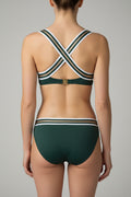 Bikini set Énergie Nautique de Lise Charmel en verde ciprés que combina elegancia deportiva con sofisticación. El top presenta espalda cruzada y almohadillas integradas para un soporte óptimo, mientras que la braga de corte bajo ofrece comodidad y libertad de movimiento. Ambas piezas lucen una banda decorativa bajo el pecho y en la cintura con detalles dorados que aportan un toque de lujo. Diseño versátil que transita sin esfuerzo del mar a la ciudad.