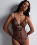 The Crazy in Love bodysuit by Aubade combines a sophisticated brown animal print with embroidered tulle, creating an elegant and sensual garment. Its back straps with gold detailing add an exclusive and refined touch, while the thong-style design ensures a comfortable and flattering fit. Ideal for those seeking an intimate piece that combines style and sophistication with expert craftsmanship.