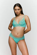 This Amelia set from Sardá combines elegance and sustainability with a non-padded underwire bra that offers comfortable support and a sheer design that enhances feminine delicacy. The double straps add a distinctive touch, while the icy lace and crystals provide sophistication and sensuality. The almost invisible thong panty guarantees a perfect fit under any garment. Available in a beautiful turquoise color, it is made with sustainable materials that are gentle on the skin and the environment. A success in style and comfort.