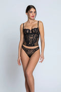 This special Desirs de Venise set by Lise Charmel includes three pieces: a low balconette, a cincher, and a G-string, all crafted from black Leavers lace. Its design combines sophistication and sensuality, offering discreet luxury that elegantly enhances femininity. Ideal for those seeking exclusive lingerie that provides comfort and refined style.