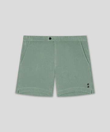 These aquamarine terry cotton shorts pay homage to the iconic '80s tennis shorts worn by legends like Björn Borg, Jimmy Connors, and John McEnroe. Crafted from an organic cotton and elastane blend, they offer exceptional softness and a slightly tapered fit with side vents for added comfort. They feature a RON DORFF-engraved button, two side pockets, and subtle black lacquered eyelets. Pre-washed to minimize shrinkage, they combine retro style with modern functionality.
