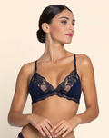 Sujetador triangular sin aros que combina comodidad y elegancia. Su diseño ligero ofrece un efecto natural impecable, perfecto para el día a día. Destaca por su escote bordado con lentejuelas, la parte inferior en malla satinada y la espalda en tul lycra con banda festoneada bordada. Los tirantes lucen delicados motivos de guipur que añaden un toque de sofisticación. Una prenda versátil que equilibra confort y estilo refinado.